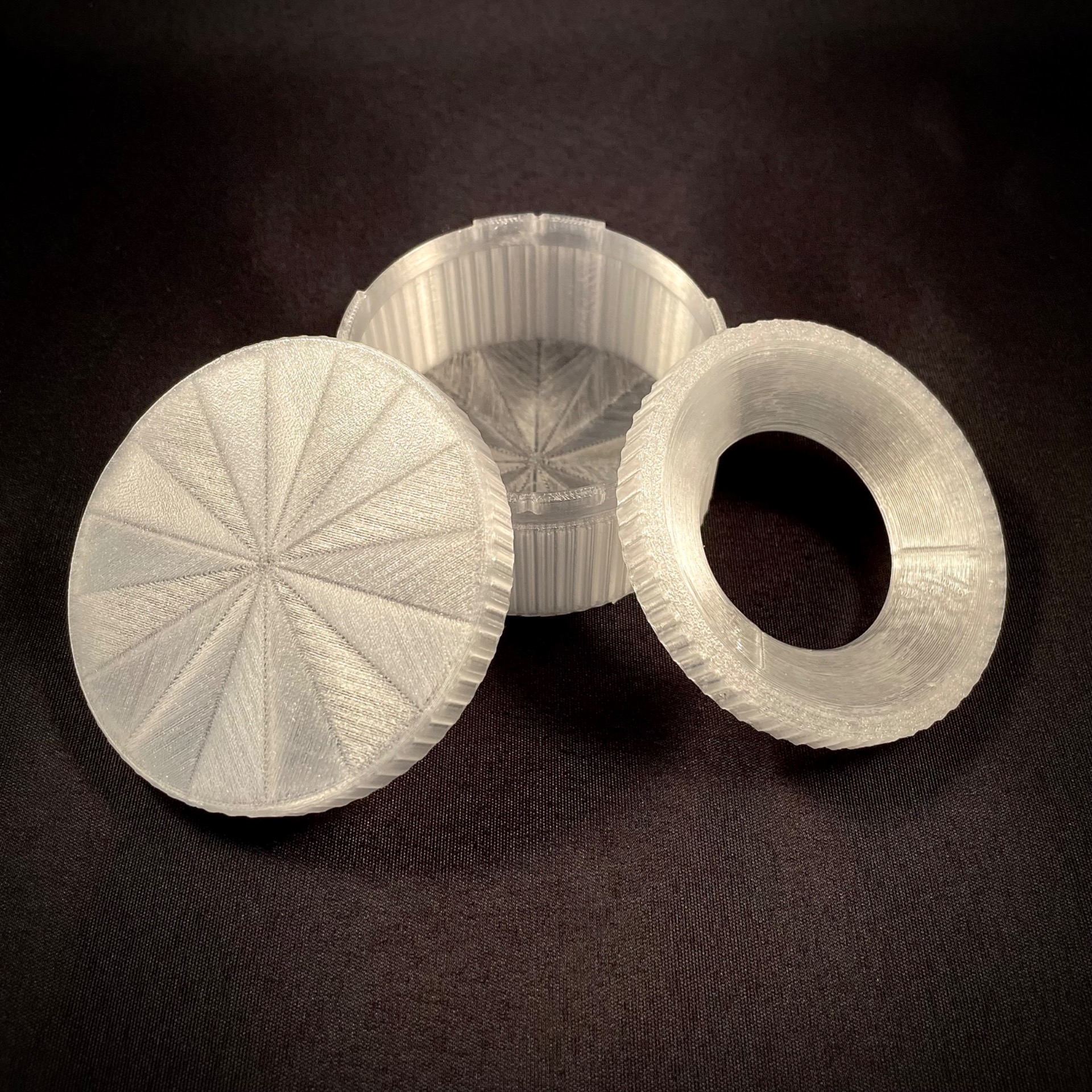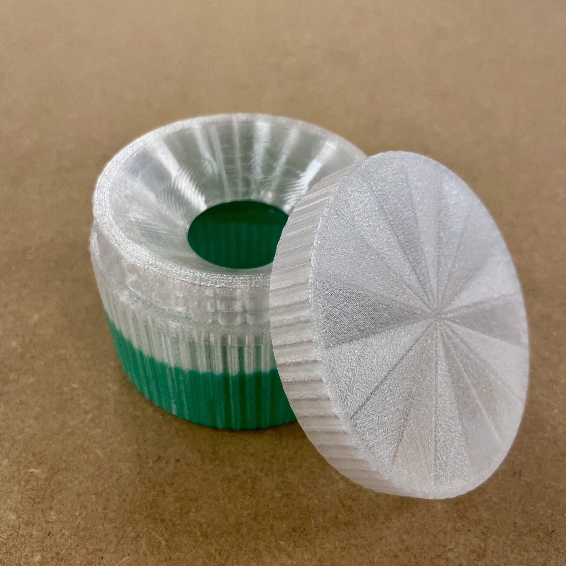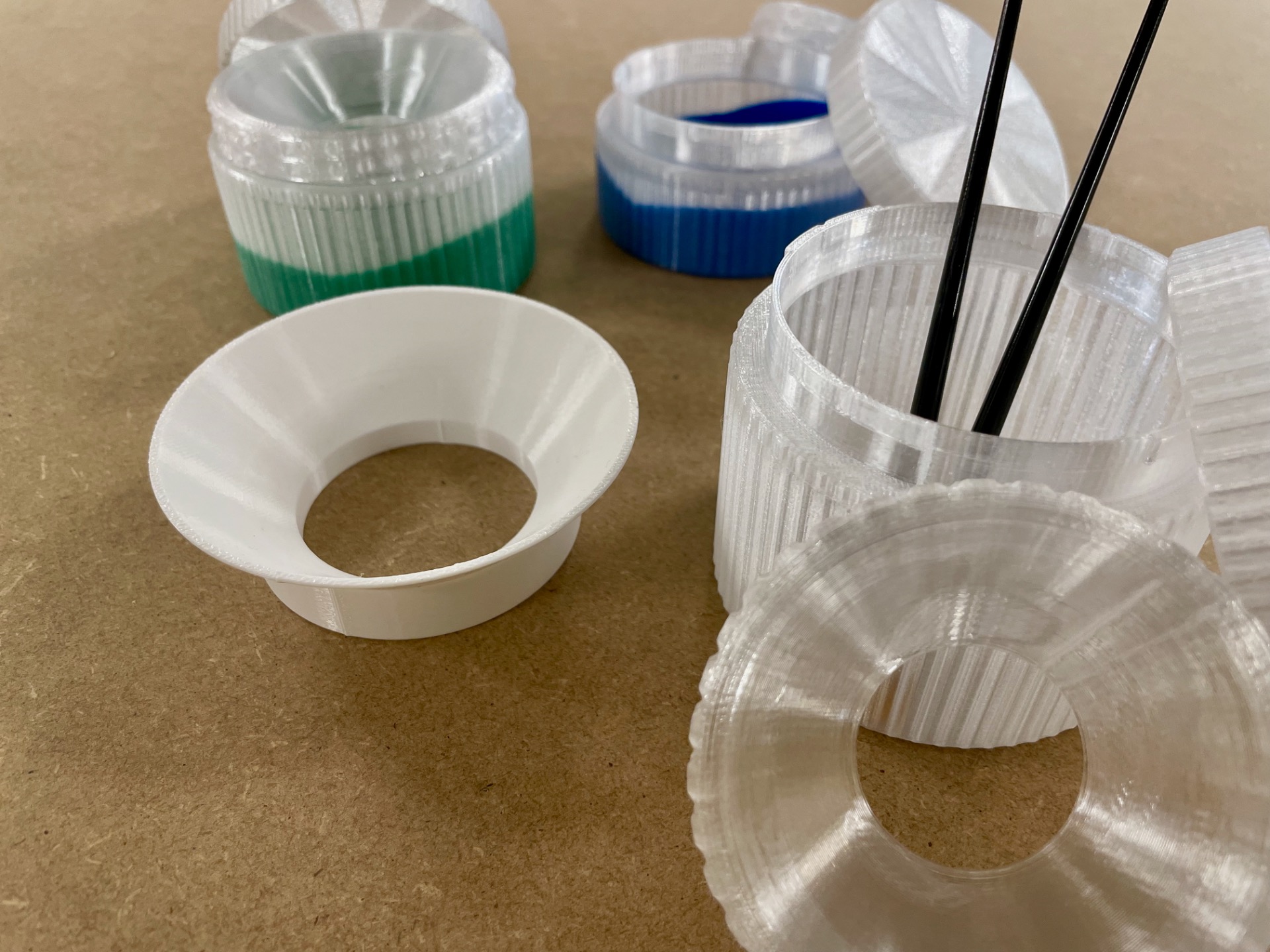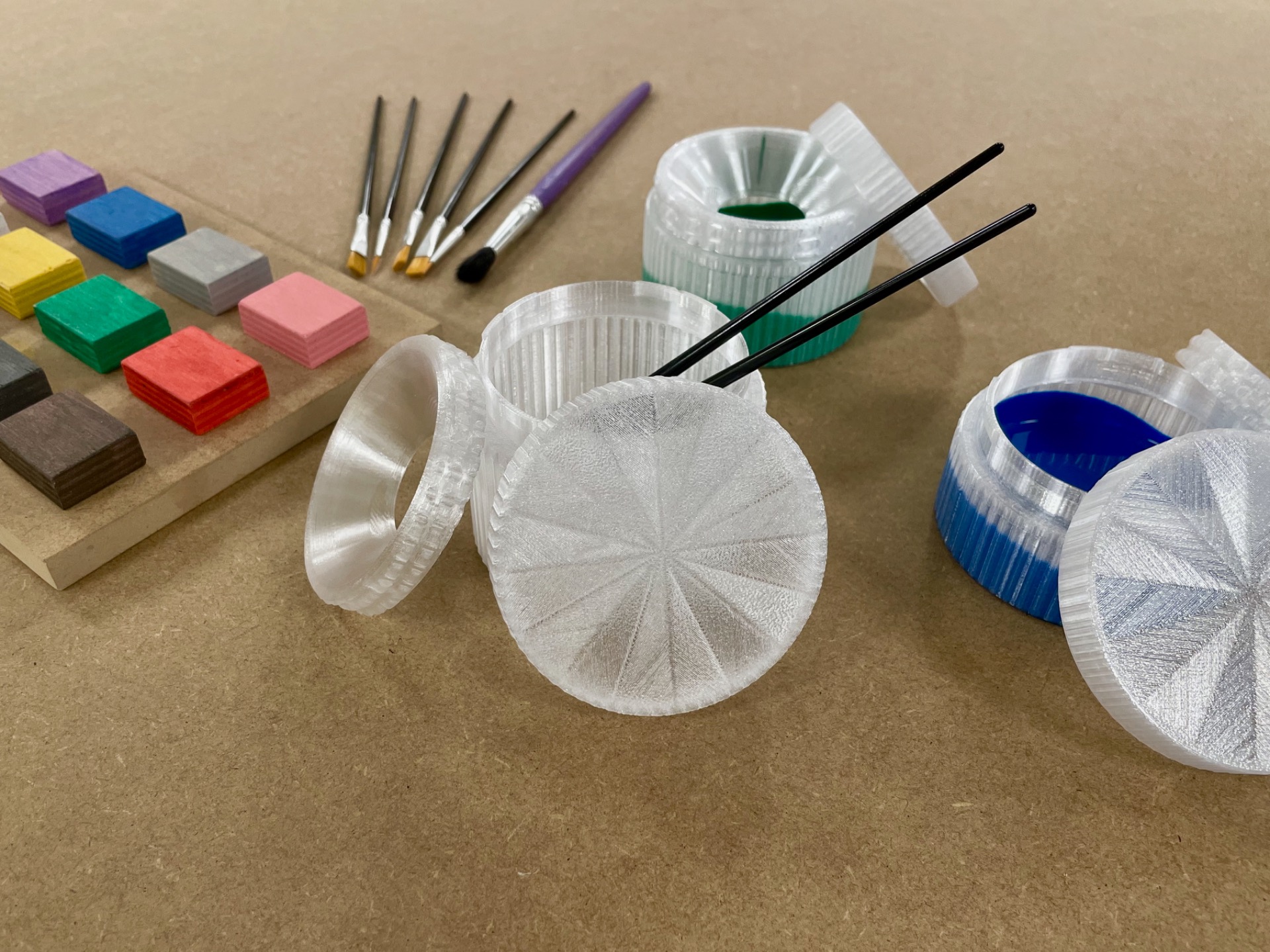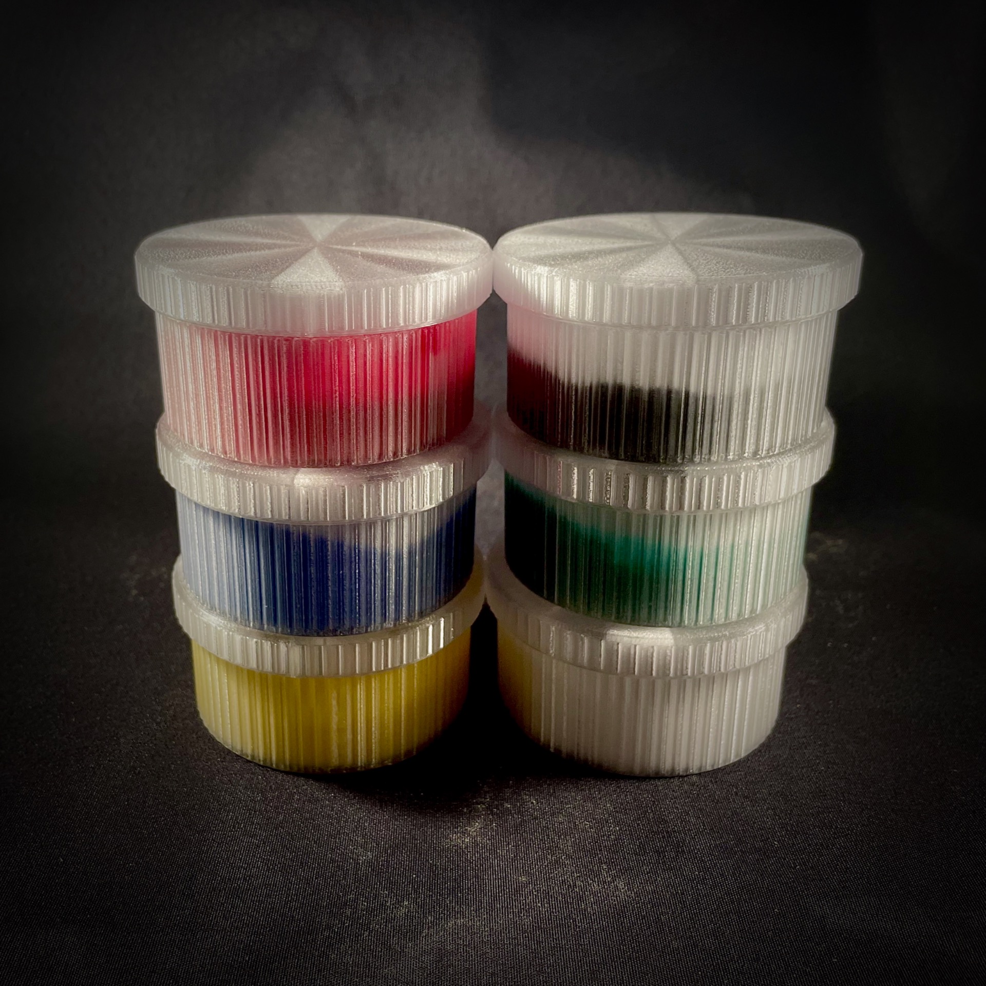 Dessa färgburkar tillverkas med 3D-skrivare i materialet PETG, ett populärt och mångsidigt filament som kombinerar styrka, flexibilitet och värmetålighet. Perfekt för hållbara och pålitliga burkar som klarar vardagens användning.